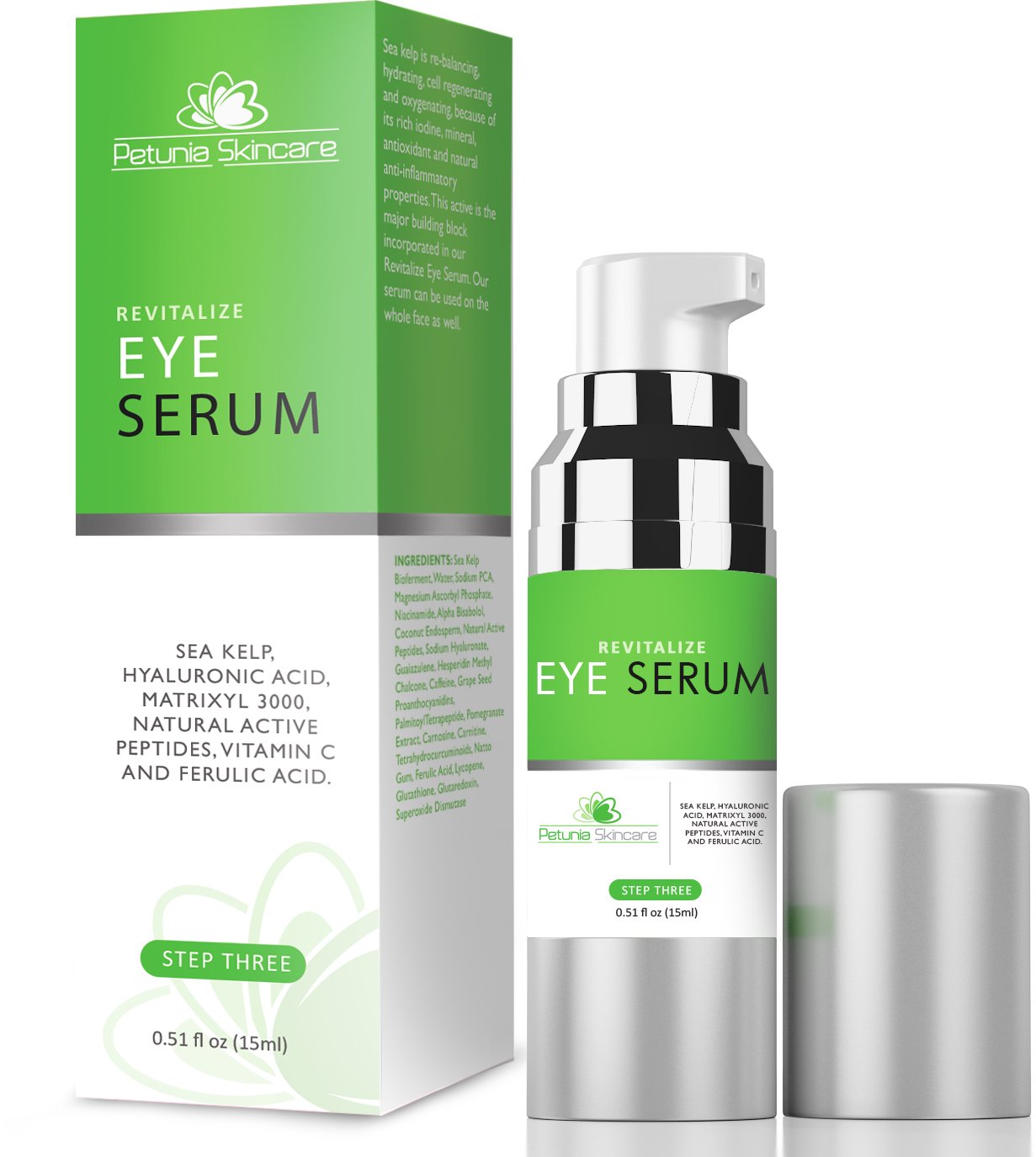 - HYDRATES, FIRMS & PLUMPS SKIN - Used twice daily, Petunia Skincare's Revitalize Eye Serum will repair and protect the delicate areas around the eyes. Our formula includes the following ingredients proven to hydrate, repair and firm the skin: Sea Kelp, Sodium PCA, Vitamin C, Matrixyl 3000, Hyaluronic Acid, Pomegranate Extract, Ferulic Acid and much more